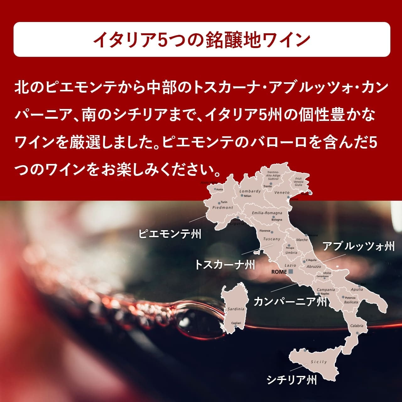 北のピエモンテから、中部のトスカーナ、アブルッツォ、カンパーニア、そして南のシチリアまで、イタリア5州の個性豊かなワインを飲み比べいただける、お得な5本セットです。