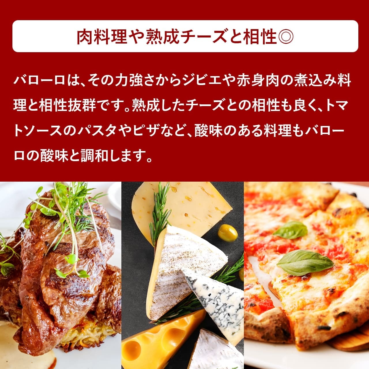その力強さから、ジビエや赤身肉の煮込み料理と相性抜群です。熟成したチーズとの相性も良く、トマトソースのパスタやピザなど、酸味のある料理もバローロの味わいと調和します。