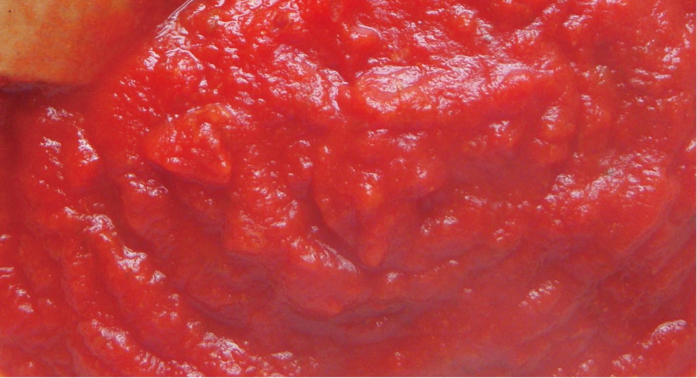収穫したての完熟トマトを 4x4mm メッシュでカットし、トマトジュースに漬けています。