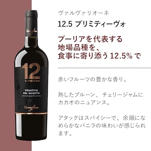プーリア州を代表する地場品種プリミティーヴォで造られた赤ワインです。除梗破砕後、24-28℃のタンクでマセラシオン。MLF後、アメリカ産バリックで最低でも6か月熟成しています。