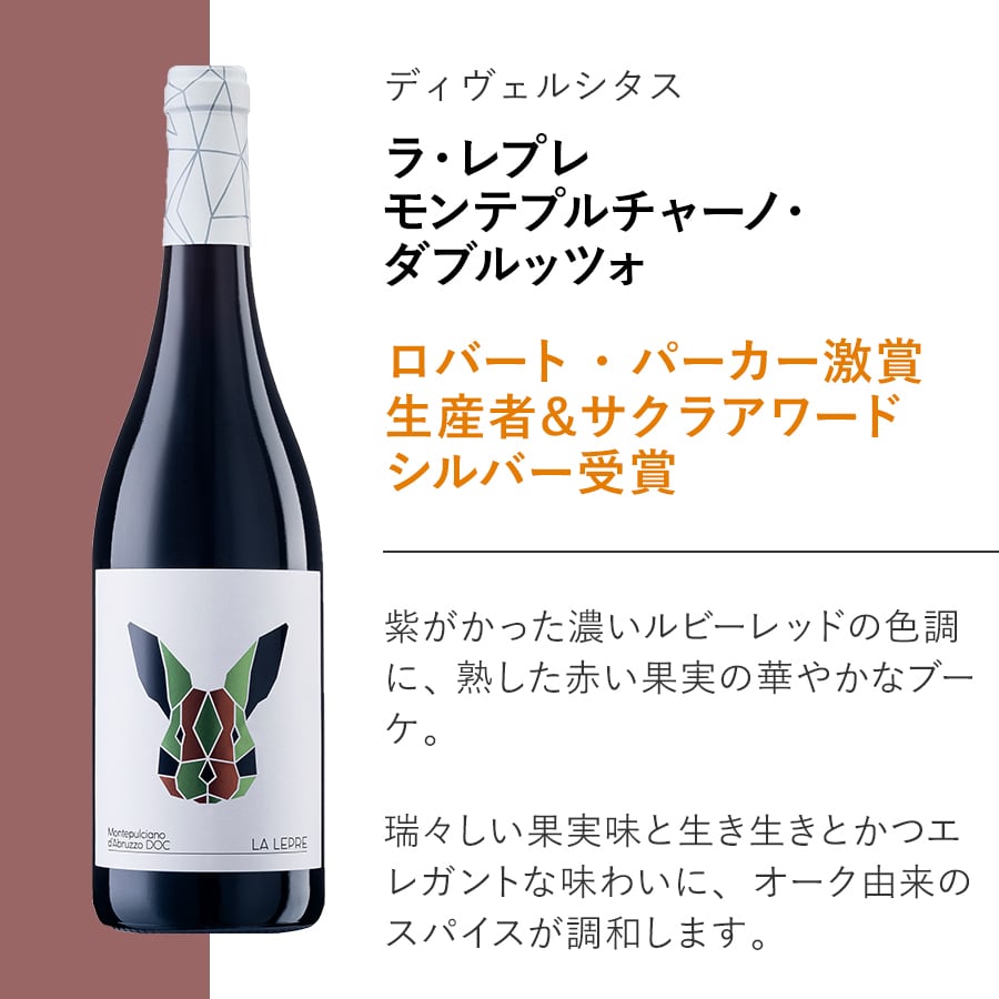ラ・レプレ(イタリア野ウサギ)は、俊敏さと生命力の象徴。州を代表するモンテプルチャーノに姿を重ね、最も愛される品種としてこれからも力強く走り続けることを願って描かれています。