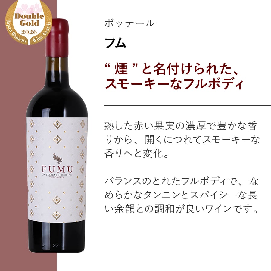 『フム』はシチリア方言で『煙』の意味。畑の火山性土壌と、収穫した葡萄を、二番樽を使った小型の無炎オーブンで10日間じっくりと低温燻製することで得られる、スモーキーな風味にちなんでいます。
