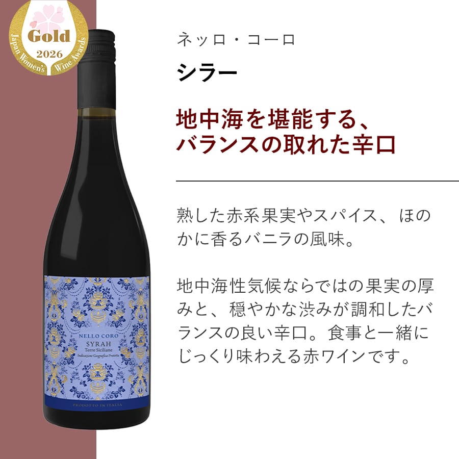 シチリアの気候と太陽が育んだシラーを使用した、食事と一緒にじっくり味わえる赤ワインです。