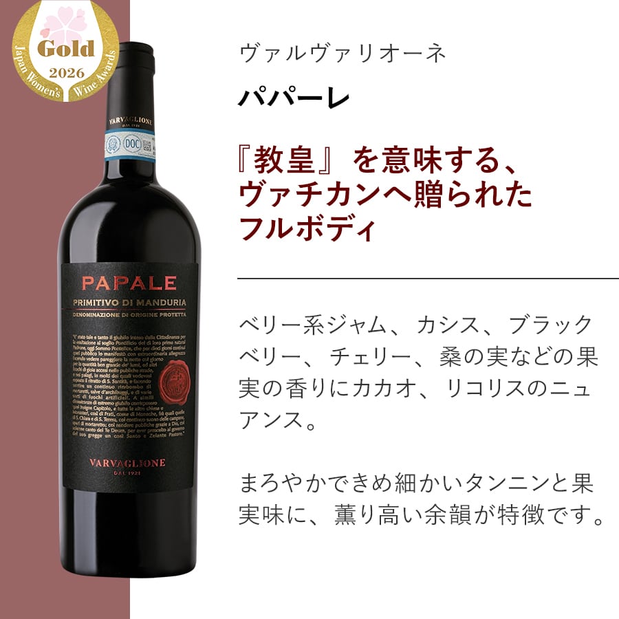 2013年にフランチェスコ教皇が選出された『コンクラーベ』時にヴァチカンへ贈られた、特別なワイン『パパーレ(=教皇)』です。かつてプーリア出身のローマ教皇・ヴェネディクト13世が所有していた土地の中で、樹齢25年以上の葡萄を厳選して収穫しています。