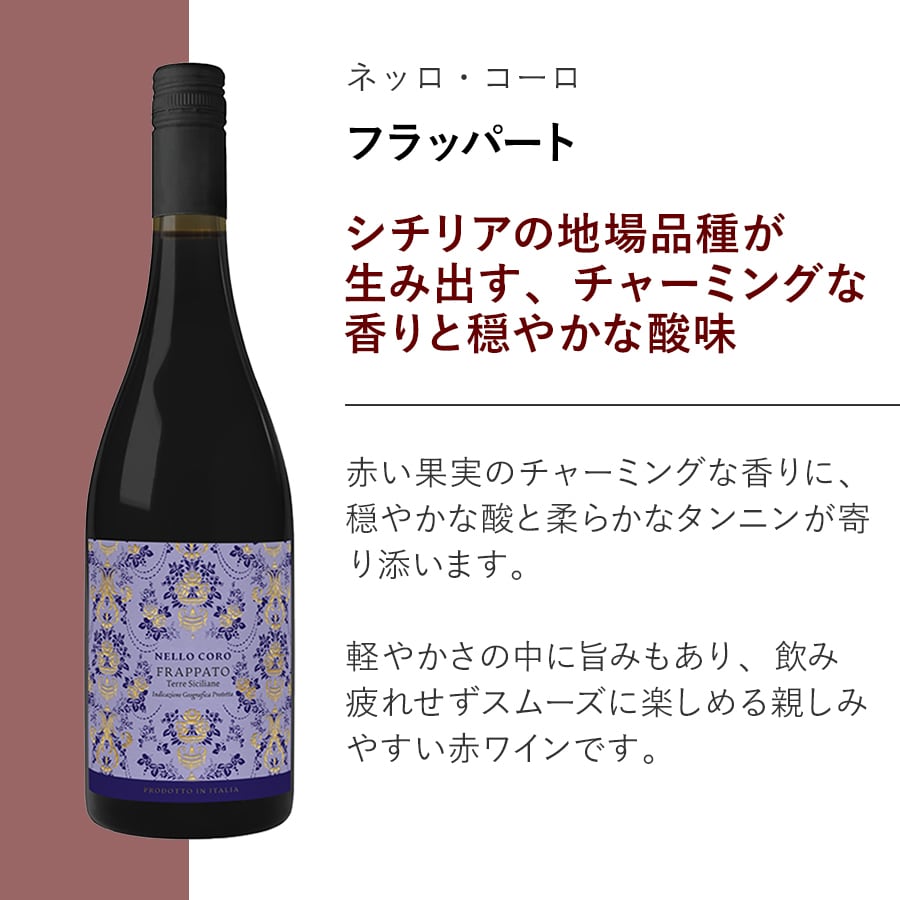シチリアで最も古い地場品種のひとつである、フラッパートを使用。軽やかさの中に旨みもあり、飲み疲れせずスムーズに楽しめる親しみやすい赤ワインです。
