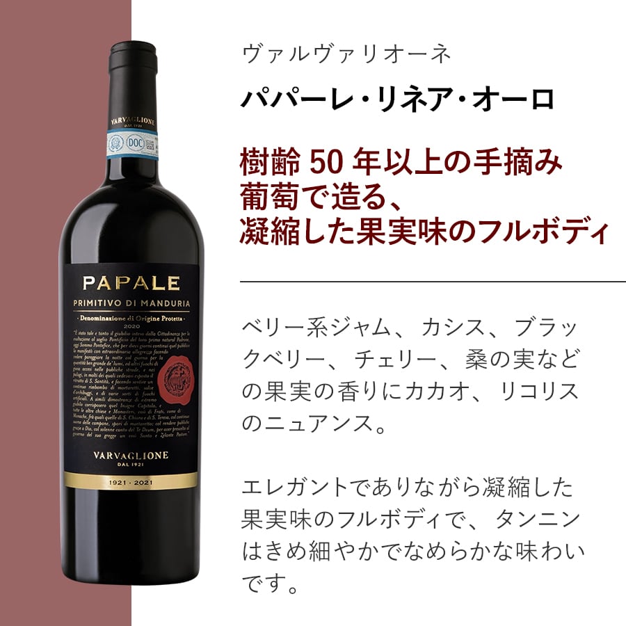 その中でもこの【パパーレ・リネア・オーロ】は、樹齢50年以上の葡萄から厳選して収穫、醸造しているため、濃厚さがお楽しみいただけます。